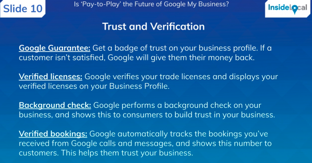 Ben went on to why these might have a cost attached. “A background check costs Google money, the Google Guarantee costs up to $2,000, and verified licenses can’t currently be scraped so would have an associated cost. All these trust and verification features are great for the consumer, and they’re great for the business, and great for us as agencies because fewer businesses might be suspended!”