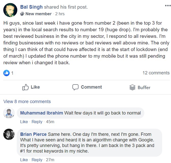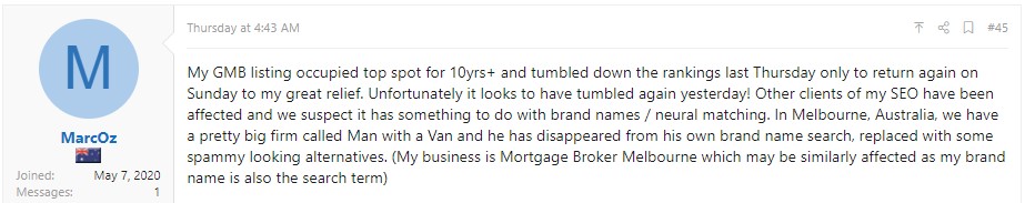 Across the forums, we’ve seen lots of businesses reporting normally well-performing businesses bouncing around local results, with many seeing large drops followed by returning to normality soon after.